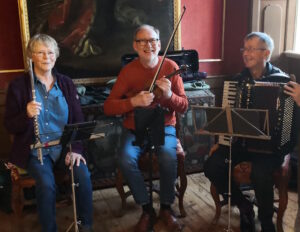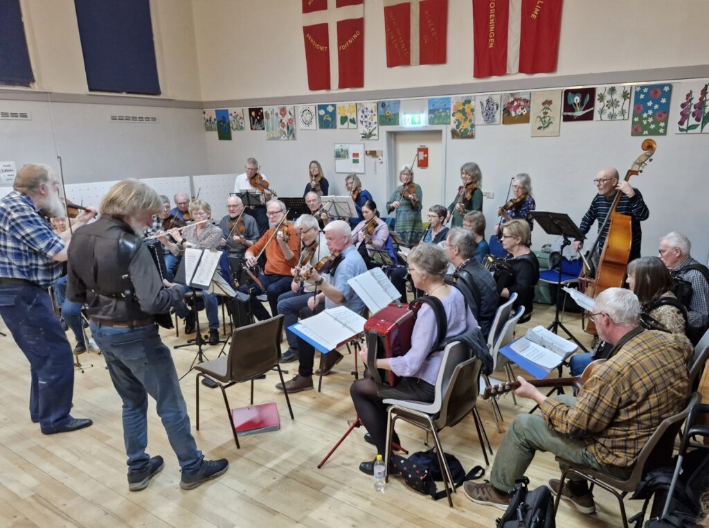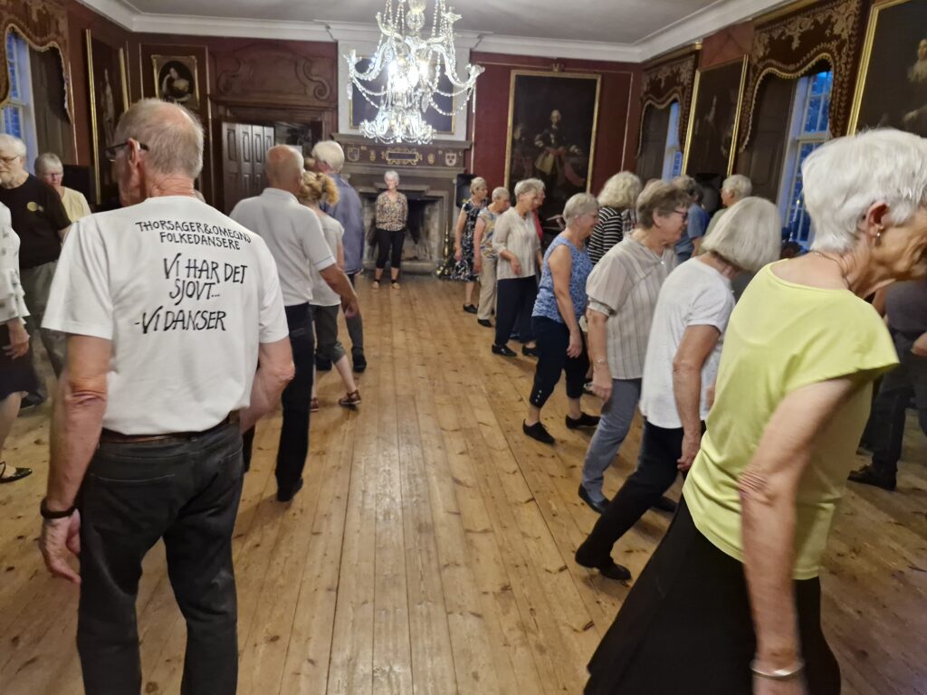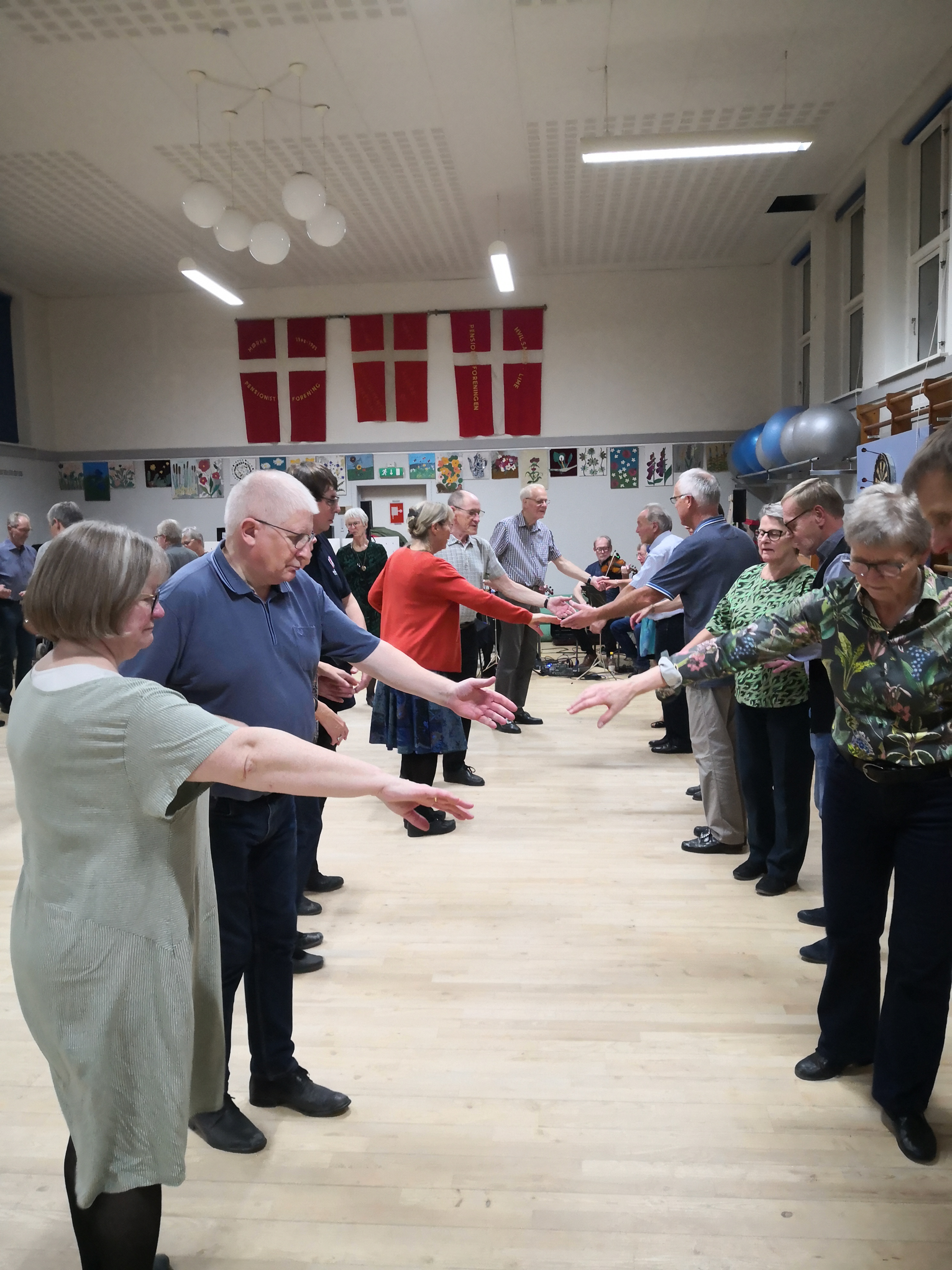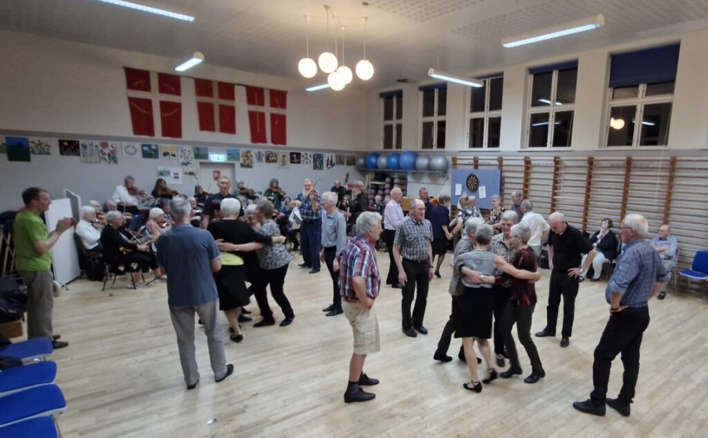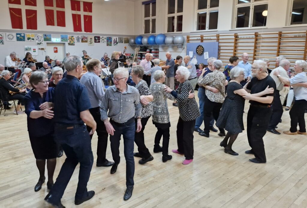 Vi danser alle de traditionelle danske folkedanse samt lidt udenlandske med instruktør og til levende musik med 3 spillemænd.